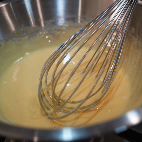 Set up a double boiler over low heat. In the top bowl, whisk together egg yolks and sugar vigorously. This step takes about 6 to 8 minutes. You are looking for a pale, thick, almost fluffy texture. It should feel silky and warm when it’s ready.