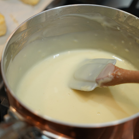 Cook the custard: Place the saucepan over medium heat and begin stirring constantly with a spatula or whisk. As the mixture warms, it will start to thicken. Be patient and do not stop stirring, as this prevents lumps and burning. If you notice the egg beginning to curdle or clump, immediately remove the pan from the heat and stir vigorously to smooth it out. Continue cooking until the custard coats the back of a spoon and holds its shape. Remove from the heat and let it cool completely.