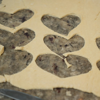 Prepare the puff pastry: You can either buy a sheet of puff pastry or make my recipe here! Preheat your oven to 400°F and line a baking sheet with parchment paper. Lightly flour your work surface and gently roll out the puff pastry until it is even in thickness. Using a heart-shaped cookie cutter, or carefully with a knife, cut out as many hearts as you can fit. Gather any scraps, roll them out again, and continue cutting until you have used up all the dough. Place each pastry heart onto the prepared baking sheet, leaving about one inch of space between them.